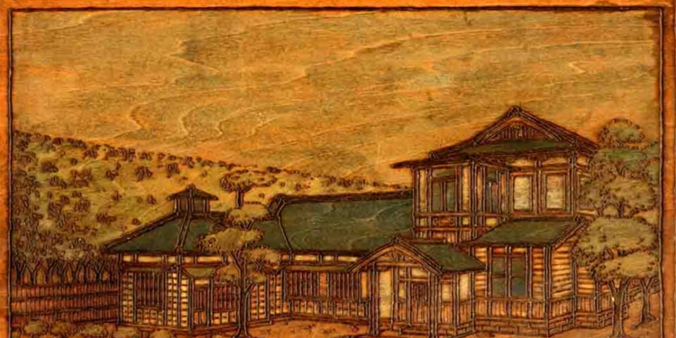 - 大正期の、竣工まもない和洋館の木彫が現存している。板目を夕焼け雲に見立てたなかに建物全体を悠然と浮かび上がらせている。
